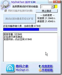 MyDiskTest是一款USB Flash Drive/SD卡/CF卡等移動存儲產品擴容識別工具,可以方便的檢測出存儲產品是否經過擴充容量,以次充好。