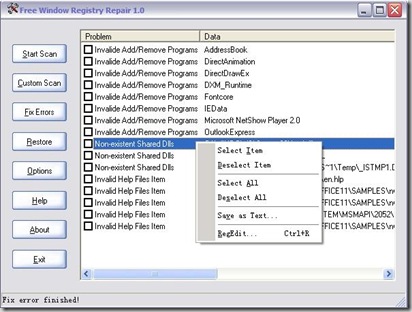 簡單明瞭的一個註冊表修復清理免費軟件,界面簡潔明快,功能上也是簡單明瞭,常用功能也非常齊備,掃瞄速度也非常的快,軟件提供了定制掃瞄功能,掃瞄時可以忽略用戶指定的註冊表分支,修復錯誤後也可以隨時選擇某次操作的備份文件進行還原操作,同時也提供了修復之前創建系統還原點的選項(XP)。根據作者提供的說明,該軟件可以在微軟的所有 Windows 操作系統中運行