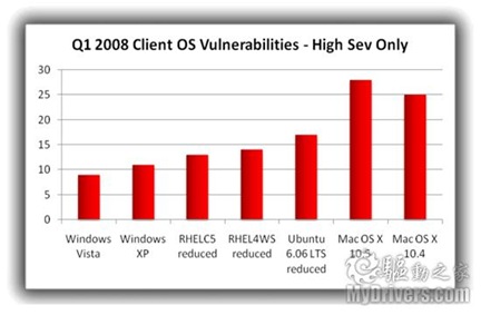 微軟安全技術部門策略總監Jeff Jones今天公佈了2008年第一季度客戶端操作系統漏洞統計報告,對比了七款系統。當然,報告出自微軟之手,結果也是可以預料的:Windows Vista最安全,三個月內只有9個漏洞,Windows XP以12個漏洞次之;Ubuntu 6.06多達54個,Red Hat兩個版本分別有60個和75個,Mac OS X更是超過了80個。在安全公告和補丁發佈頻率方面,Windows和Mac OS X表現最好的,Red Hat最差。......