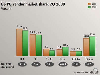 在全球市場上,惠普仍排名第一,佔有18.1%市場份額。其他前五強廠商情況分別是戴爾(15.6%)、宏碁(9.4%)、聯想(7.8%)、東芝(4.4%)。在全球市場上戴爾仍然遠遠落後於惠普,蘋果根本排不到五強,但是在美國市場上情況則不盡相同。......