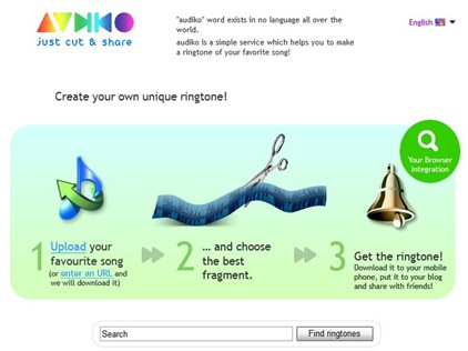 Audiko 是一個相當小型的線上手機鈴聲剪切器,可以方便使用者在線上切出合適長度的音樂作為手機鈴聲。丟掉笨重的音樂編輯軟體吧!想要一個30秒的手機鈴聲還要大費周章嗎?透過 Audiko 網站只要三個步驟,輕鬆將音樂剪輯為鈴聲。而且更支援iPhone鈴聲格式。
