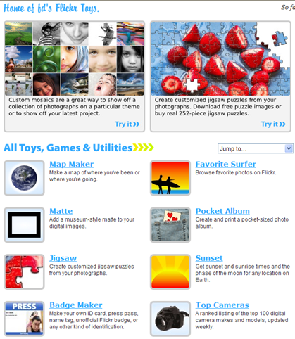 Bighugelabs 這個線上工具可以直接將 Flickr 上的相片加工,組合,變化成許多不同特效, 如mosaic, 拼圖, 另外有結合Google Map 可列出旅遊過的國家, 日出日落時間查詢,還有照片牆, 雜誌封面, CD套, wordpress的header, 甚至還有個 Flickr DNA, 可調出 此 Flickr 使用者所有底細.