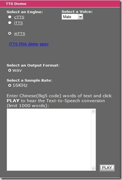 台灣工研院資通所前瞻技術中心所研發的「中文文字轉語音合成系統」,可以讓使用者將欄位中所輸入的中文字「唸」出來,而且還提供了不同的語音呈現方式可做選擇。