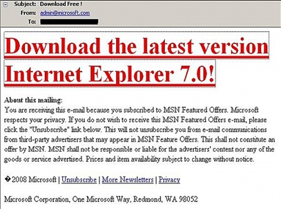 留心觀察這個要你下載最新版IE 7.0的郵件,它看起來很正規,因為顯示的發件人是admin@microsoft.com,但是『Download the latest version Internet Explorer 7.0』鏈接卻指向一個惡意的URL。