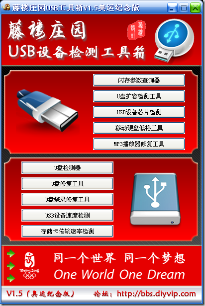 本軟件為免費軟件,集成了10個網上流行的USB設備的檢測工具,能夠對大多數USB接口的U盤、移動硬盤、MP3播放器等設備進行檢測或修復。本軟件所採用的10款工具均來源於網絡,其版權歸原作者所有,本軟件只進行聚合與推廣,方便大家對USB設備的應用。