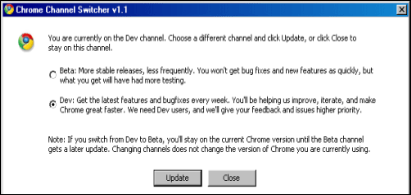 如果你想要使用比官方beta升級還要更新的Google Chrome瀏覽器,你可以在Google上下載「Chrome Channel Chooser」。然後運行它,在彈出的對話框中選擇Dev選項,然後點Update按鈕。